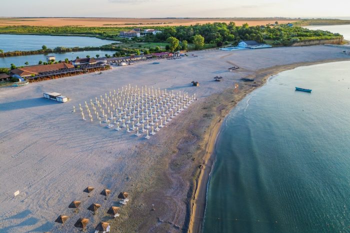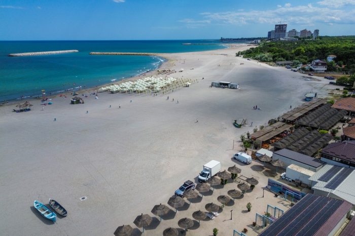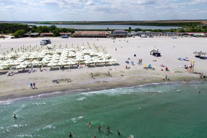 Plaja cu umbrele și șezlonguri gratuit pe plaja Popasul Pescarilor Olimp